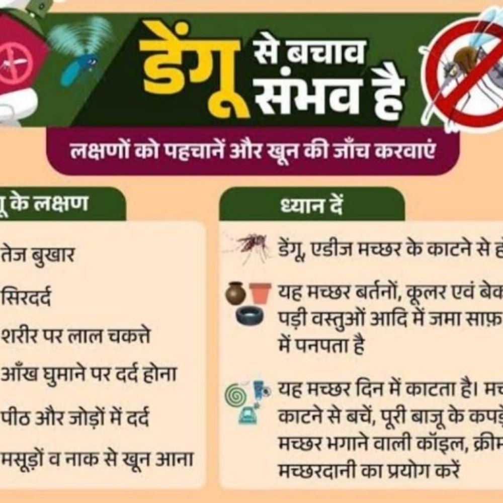 रोकथाम के उपाय • घर और आसपास पानी जमा न होने दें। • पानी की टंकियों व बर्तनों को ढककर रखें। • मच्छरदानी का उपयोग करें और पूरी आस्तीन के कपड़े पहनें। • मच्छरनाशी दवाओं का छिड़काव व फॉगिंग करवाएं। • कूलर/टंकियों में सप्ताह में एक बार तेल डालें। • किसी भी संदिग्ध मामले की सूचना तुरंत स्वास्थ्य विभाग को दें।