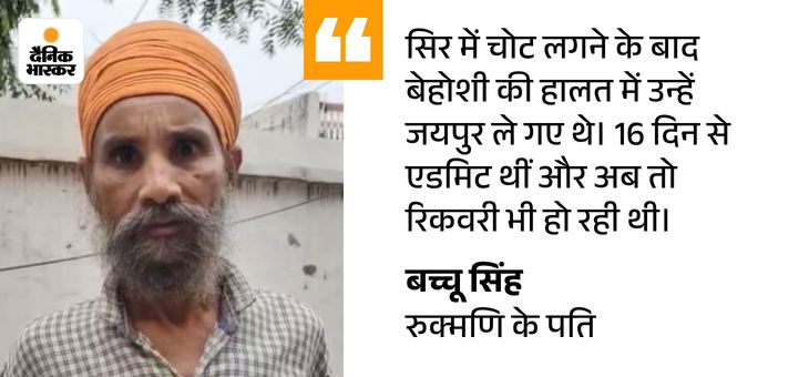 रुक्मणि के पति बच्चू सिंह बताते हैं- पत्नी 15 दिन पहले घर में फिसलने से गिर गई थी। उसे कमर और सिर में चोट आई थी। पहले तो उन्हें भरतपुर के RBM में ले गए। जहां से उन्हें जयपुर के SMS में रेफर कर दिया। यहां वे ट्रॉमा सेंटर में एडमिट थी।