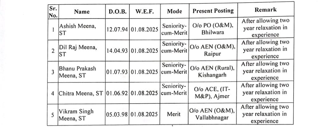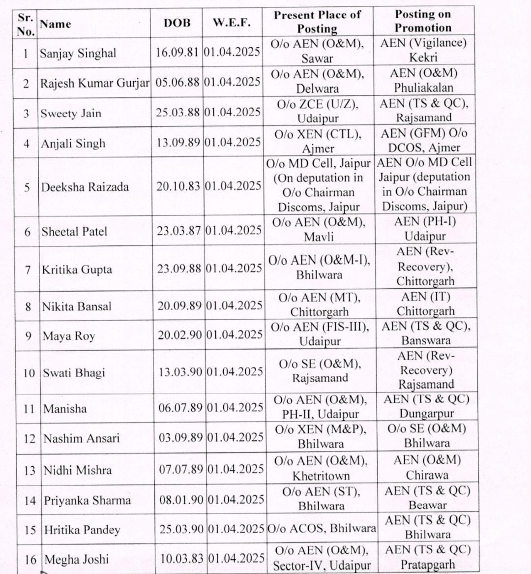 अजमेर डिस्कॉम में विभागीय पदोन्नति समिति (डीपीसी) की अनुशंसा पर 31 कनिष्ठ अभियंताओं को सहायक अभियंता पद पर और तीन एईएन को एक्सईएन के पद पर पदोन्नति दी गई। इन सभी को पोस्टिंग प्लेस भी आवंटन कर दिया है।