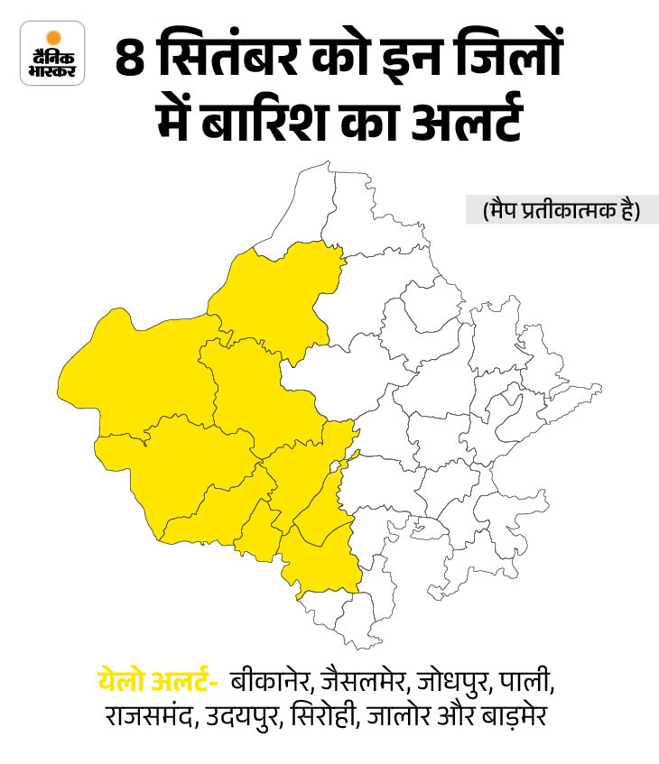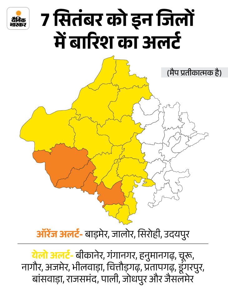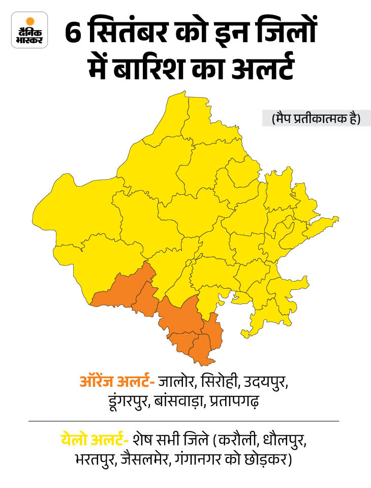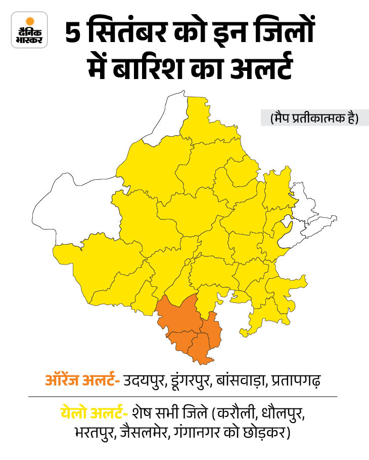 मौसम विभाग ने शुक्रवार को उदयपुर, डूंगरपुर, बांसवाड़ा और प्रतापगढ़ में बारिश का ऑरेंज अलर्ट जारी किया है। वहीं, 24 जिलों में येलो अलर्ट है।