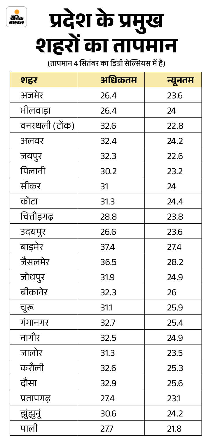 वहीं पिछले 24 घंटे के दौरान बांसवाड़ा जिले के सज्जनगढ़ में 115MM, कुशलगढ़ में 52, सल्लोपाट में 120, केसरपुरा में 52, चित्तौड़गढ़ के गंगरार में 55, चित्तौड़गढ़ शहर में 51, नागौर के परबतसर में 28, राजसमंद के रेलमगरा में 37, गिलूंड में 35, डूंगरपुर में 41, अजमेर के भिनाय में 88, गोयला में 78, सरवाड़ में 58, पीसांगन में 75, मंगलियावास में 72, किशनगढ़ में 50, अजमेर शहर में 61MM बरसात दर्ज हुई।