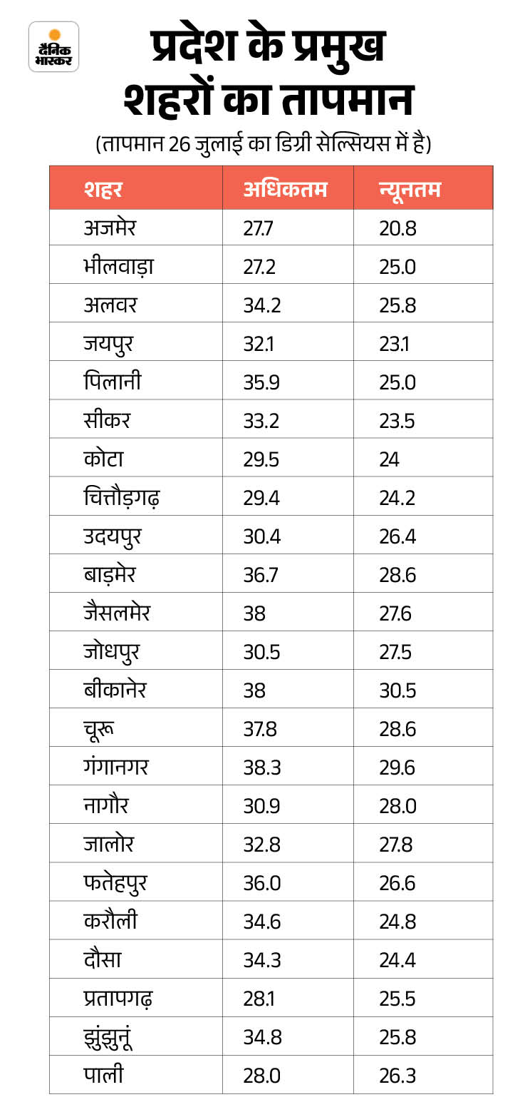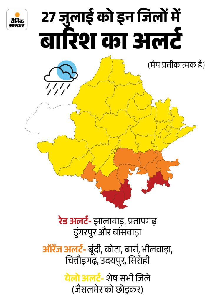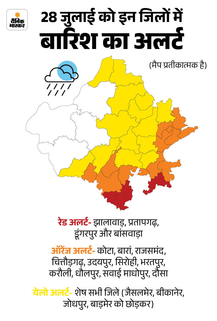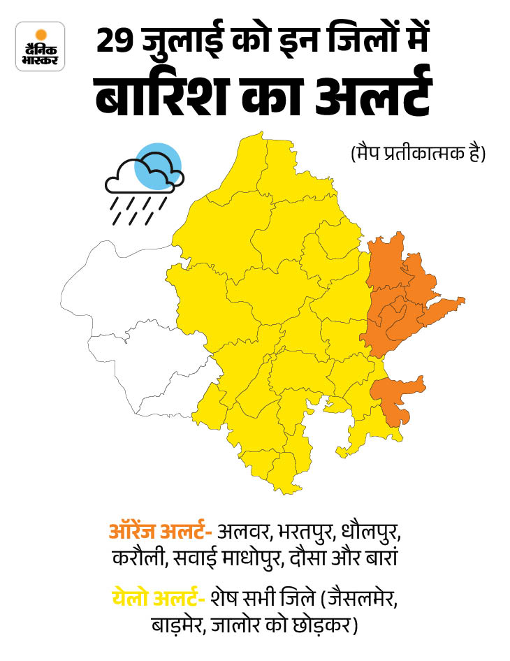 पश्चिमी राजस्थान में शुरू होगी बारिश मौसम केंद्र जयपुर के निदेशक राधेश्याम शर्मा ने बताया- इस सिस्टम के असर से दक्षिण-पूर्वी व पूर्वी राजस्थान के कुछ भागों में रविवार और सोमवार को भारी, अतिभारी बारिश होने की प्रबल संभावना है। भारी से अति भारी बारिश का दौर पूर्वी राज में 29-30 जुलाई को भी जारी रहने की प्रबल संभावना है। पश्चिमी राजस्थान के जोधपुर, बीकानेर संभाग में भी बारिश की गतिविधियों में बढ़ोतरी होने की संभावना है।