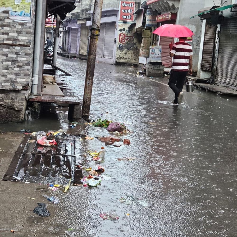 शहर के बासन गेट इलाके की सड़कों पर भरा पानी।