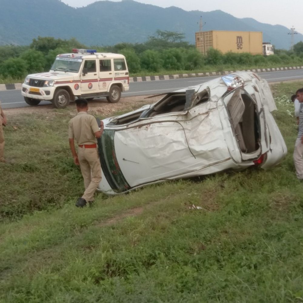 ब्यावर-पिंडवाड़ा फोरलेन पर गाय को बचाने के प्रयास में सड़क किनारे पलटी कार।