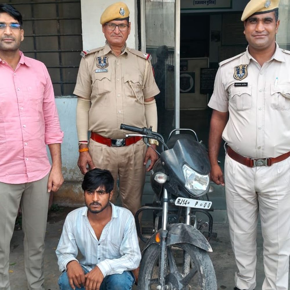 इसके बाद आज बाइक चोर बाइक चोरी के एक मामले में मोहम्मद अमन (21) पुत्र मोहम्मद अयूब निवासी म.न. 23 करीम नगर विस्तार जगतपुरा रोड थाना खो नागोरियान (जयपुर) को गिरफ्तार किया गया है।