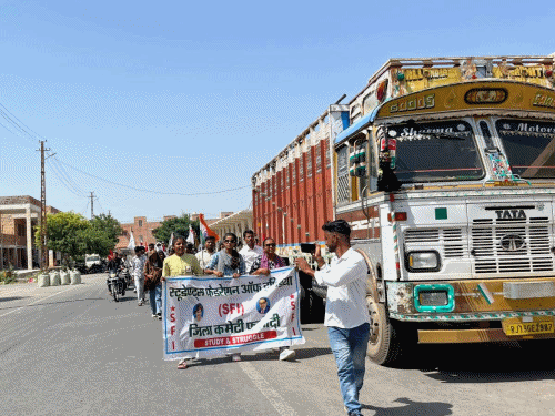स्टूडेंट्स फैडरेशन ऑफ इंडिया (एसएफआई) और विभिन्न जन संगठनों ने आज फलोदी में शहीद-ए-आजम भगतसिंह की 118वीं जयंती पर एक पैदल रैली निकाली। यह रैली जयनारायण मोहनलाल पुरोहित राजकीय महाविद्यालय से शुरू होकर कृषि मंडी होते हुए अंबेडकर सर्किल तक पहुंची। इसमें