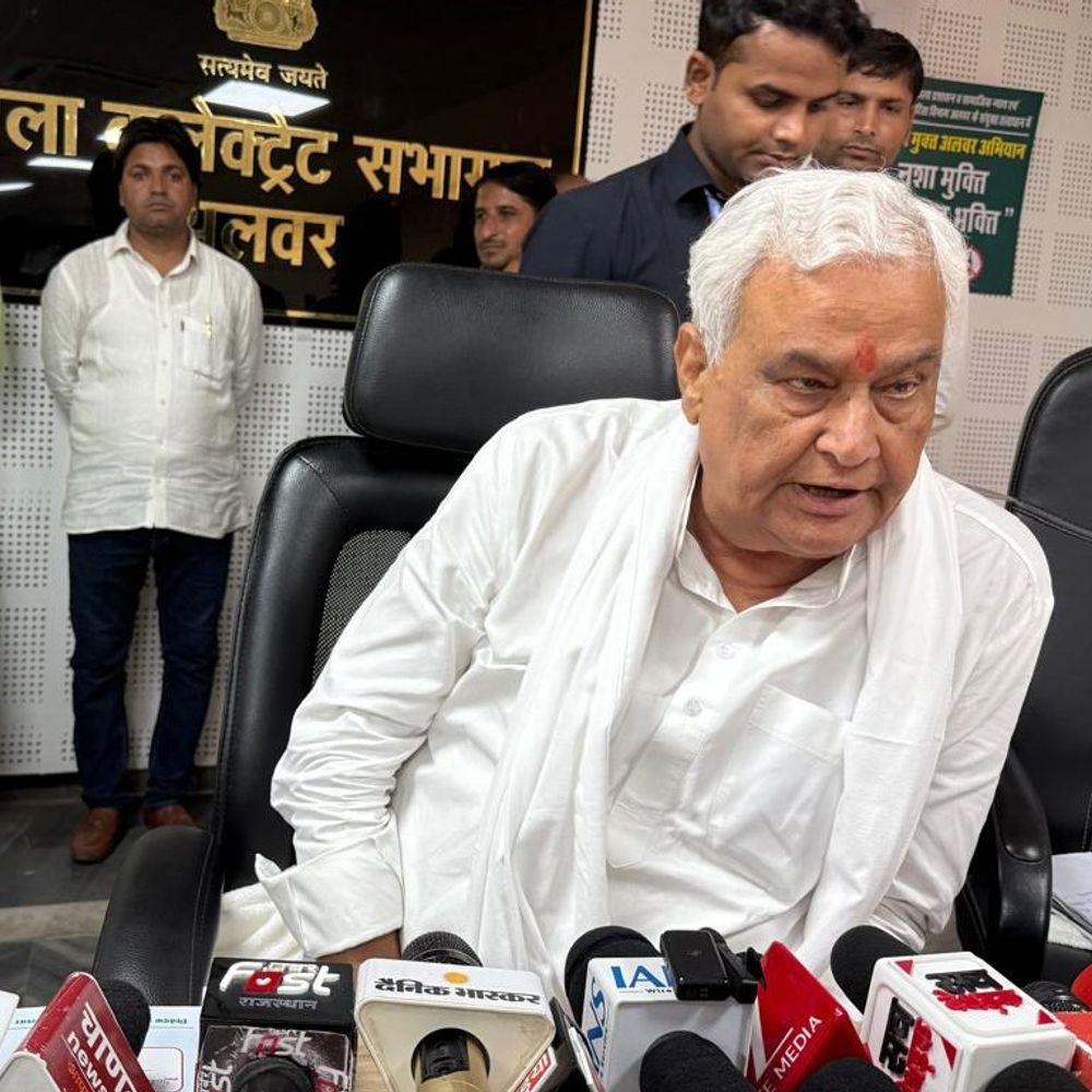 कैबिनेट मंत्री डॉ किरोड़ीलाल मीणा अलवर में मीडियो को संबोधित करते हुए।