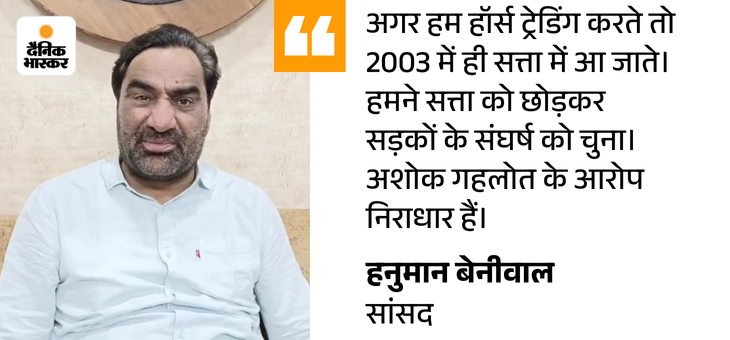 एसआई भर्ती-2021 रद्द हुई, वो गहलोत सरकार का काला कारनामा बेनीवाल ने कहा- एसआई भर्ती-2021 रद्द हुई, वो अशोक गहलोत सरकार के काले कारनामे थे। 2018 में जब गहलोत सरकार बनी, उस समय रालोपा का गठन हुआ था। रालोपा के 3 विधायक बने थे। उस समय सचिन पायलट ने समर्थन मांगा था कि रालोपा के 3 विधायक दे दो तो सीएम बन जाऊंगा। तब पायलट को 3 विधायकों का समर्थन दिया कि अगर कांग्रेस पायलट को सीएम बनाती तो रालोपा समर्थन करती। उसके बाद एनडीए अलायंस में सांसद बनकर दिल्ली चला गया। मानेसर का एपिसोड पायलट और अशोक गहलोत का झगड़ा था।