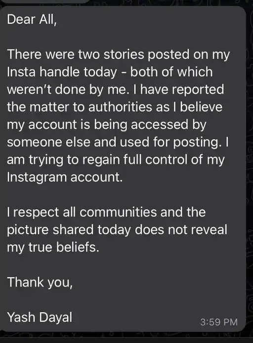 पहले भी विवादों में रहे यश दयाल यश दयाल ने 2 साल पहले अपने इंस्टाग्राम अकाउंट पर मुस्लिम विरोधी स्टोरी लगाई थी। विवाद बढ़ने पर उन्होंने स्टोरी डिलीट कर दी थी। बाद में दयाल ने सफाई में कहा था- मेरे इंस्टाग्राम अकाउंट से 2 स्टोरी पोस्ट की गई, लेकिन मैं बताना चाहूंगा कि दोनों स्टोरी मैंने पोस्ट नहीं की थी।