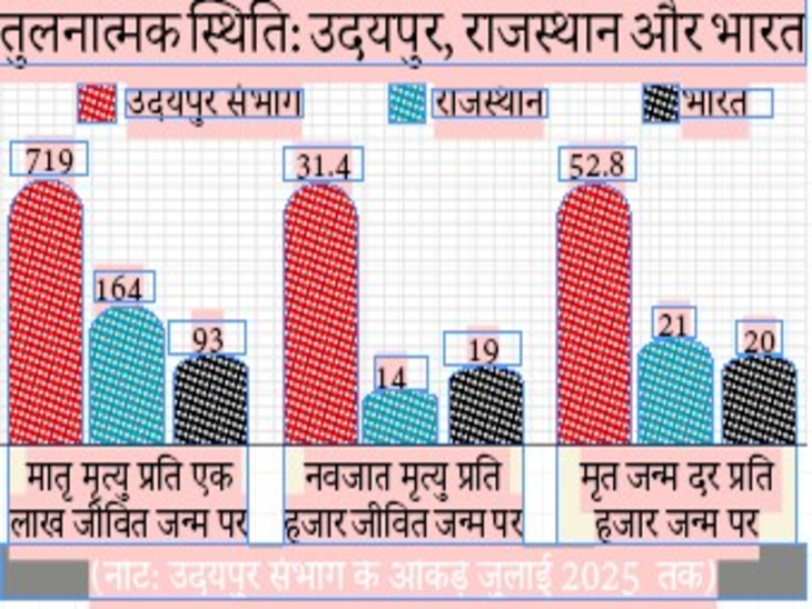 ये आंकड़े राजस्थान और राष्ट्रीय औसत की तुलना में कहीं अधिक गंभीर हैं। प्रदेश में मातृ मृत्यु अनुपात 164 प्रति लाख और नवजात मृत्यु दर 14 प्रति हजार, जबकि देश में मातृ मृत्यु अनुपात 93 प्रति लाख और नवजात मृत्यु दर 19 प्रति हजार है। पिछले वर्षों के आंकड़े भी चिंता बढ़ाने वाले हैं। वहीं, वर्ष 2022 में प्रसव के 28 दिन के भीतर 975 शिशुओं की मौत हुई थी, जबकि 2023 में यह संख्या घटकर 700 रही।