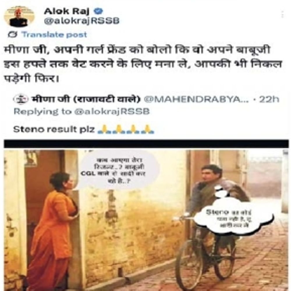 राजस्थान कर्मचारी चयन बोर्ड अध्यक्ष आलोक राज मंगलवार को भी सोशल मीडिया पर जवाबों के चलते चर्चा में रहे। उन्होंने अभ्यर्थी को शादी को लेकर सलाह दी। दरअसल, सोशल मीडिया पर मीणाजी नाम के अकाउंट पर स्टेनो रिजल्ट जारी करने की मांग उठाई गई। साथ ही एक फोटो प