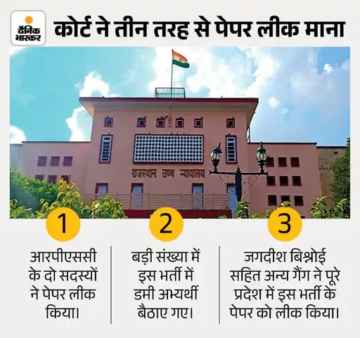 1. RPSC के तत्कालीन अध्यक्ष की भी गड़बड़ी मानी कोर्ट ने अपने 202 पेज के आदेश में कहा था- इस भर्ती के पेपर लीक होने में आरपीएससी के चेयरमैन सहित 6 सदस्यों की सक्रिय भूमिका भी सामने आई। इससे साबित है कि घर के भेदियों ने ही लंका को ढहा दिया। भर्ती की गोपनीयता तब ही भंग हो गई थी, जब आरपीएससी के पूर्व सदस्य ने हाथ लिखित पेपर प्रिंटिंग प्रेस में पहुंचने से पहले ही लीक कर दिया था। आरपीएससी के पूर्व चेयरमैन संजय श्रोत्रिय के भी मामले में शामिल होने से इसकी गंभीरता बढ़ती है।