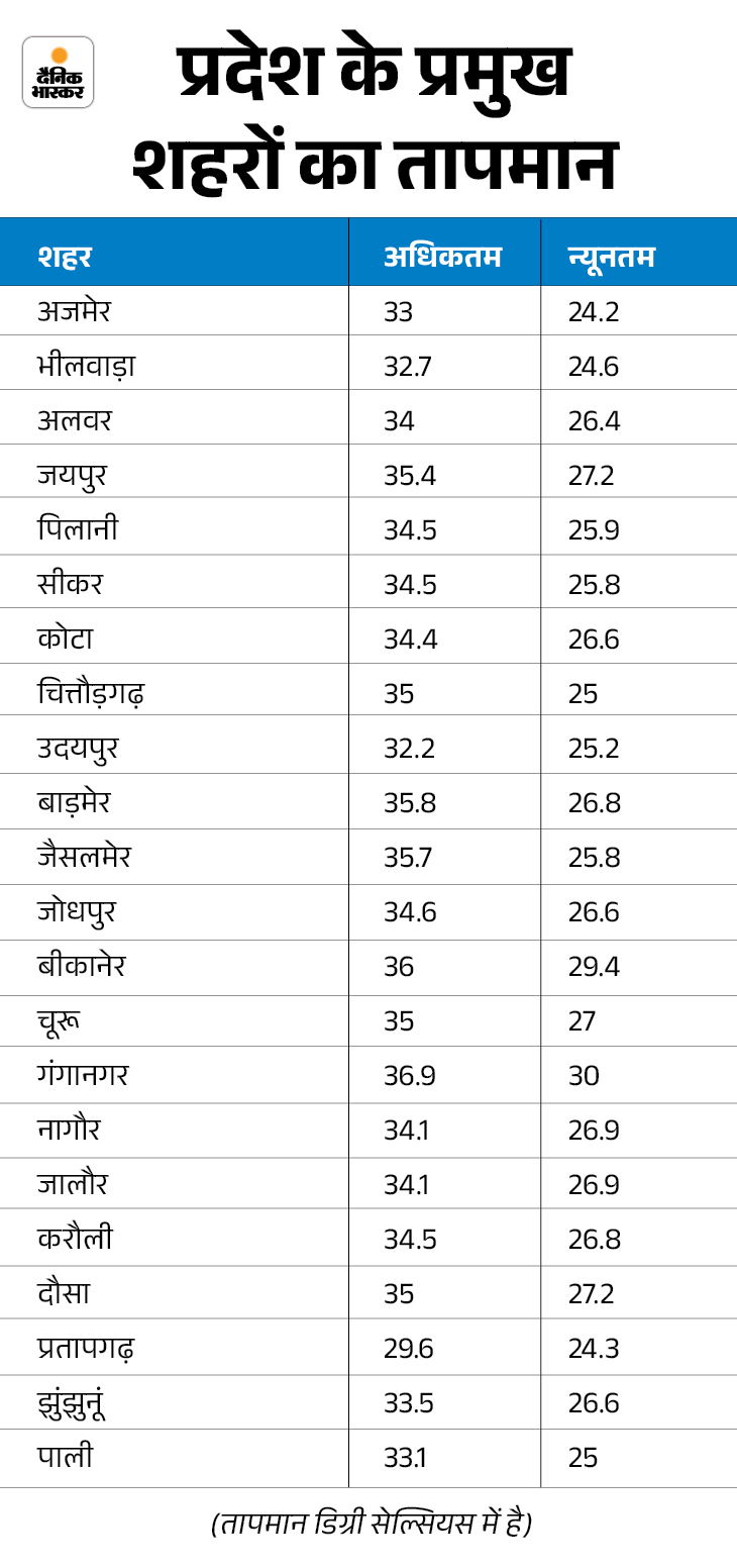 कल सबसे ज्यादा तापमान गंगानगर में 36.9 डिग्री सेल्सियस दर्ज हुआ। बीकानेर, फलौदी में अधिकतम तापमान 36-36, चूरू में 35, बाड़मेर में 35.8, जैसलमेर में 35.7, चित्तौड़गढ़ में 35, कोटा में 34.4, सीकर में 34.5, जयपुर में 35.4, अलवर में 34, जोधपुर में 34.6, हनुमानगढ़ में 34.8, जालौर में 34.1, करौली में 34.5, दौसा में 35 और अजमेर में 33 डिग्री सेल्सियस दर्ज हुआ।