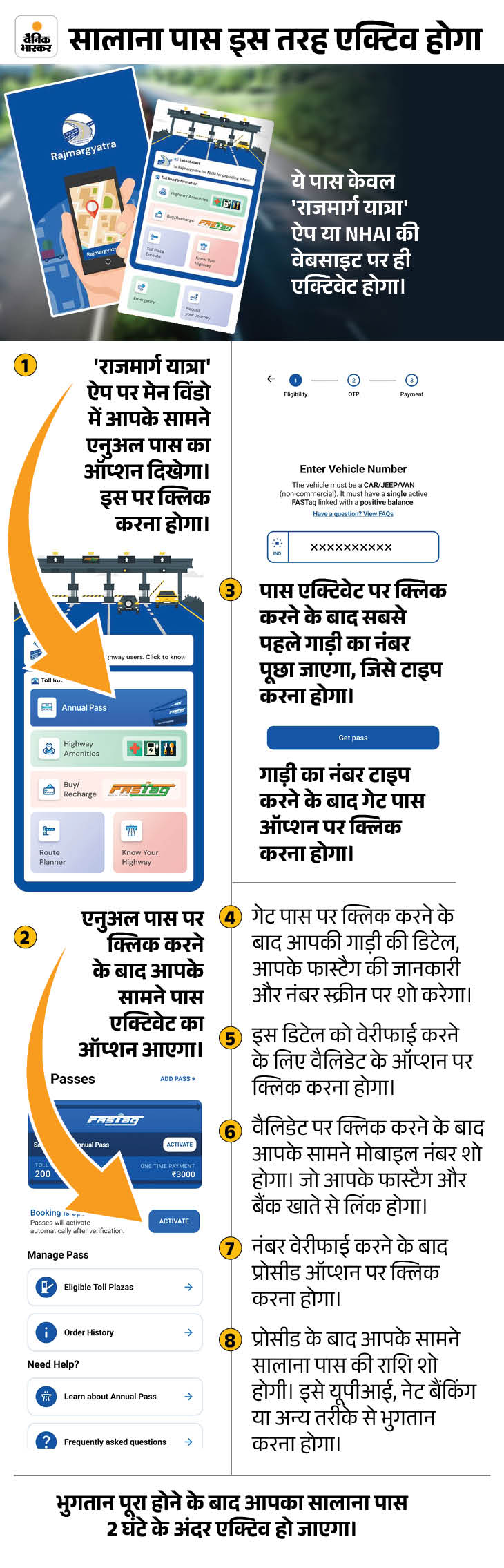 इस पास के एक्टिव होने के बाद आपके मोबाइल में डाउनलोड राजमार्ग यात्रा’ ऐप के मुख्य पेज पर आपके पास की जानकारी शो होगी। इस पास के जरिए आपने जितने भी नेशनल हाइवे के टोल बूथ क्रॉस करेंगे, उसकी संख्या शो होगी। उसके आगे कितने टोल बूथ क्रॉस करने की लिमिट शेष रहेगी, वह भी इस मुख्य पेज पर दिखेगा।