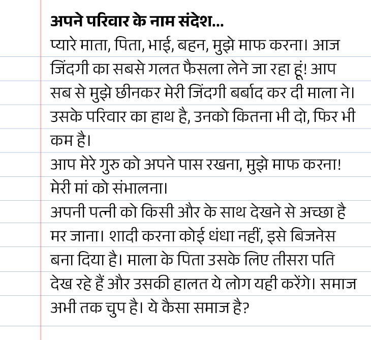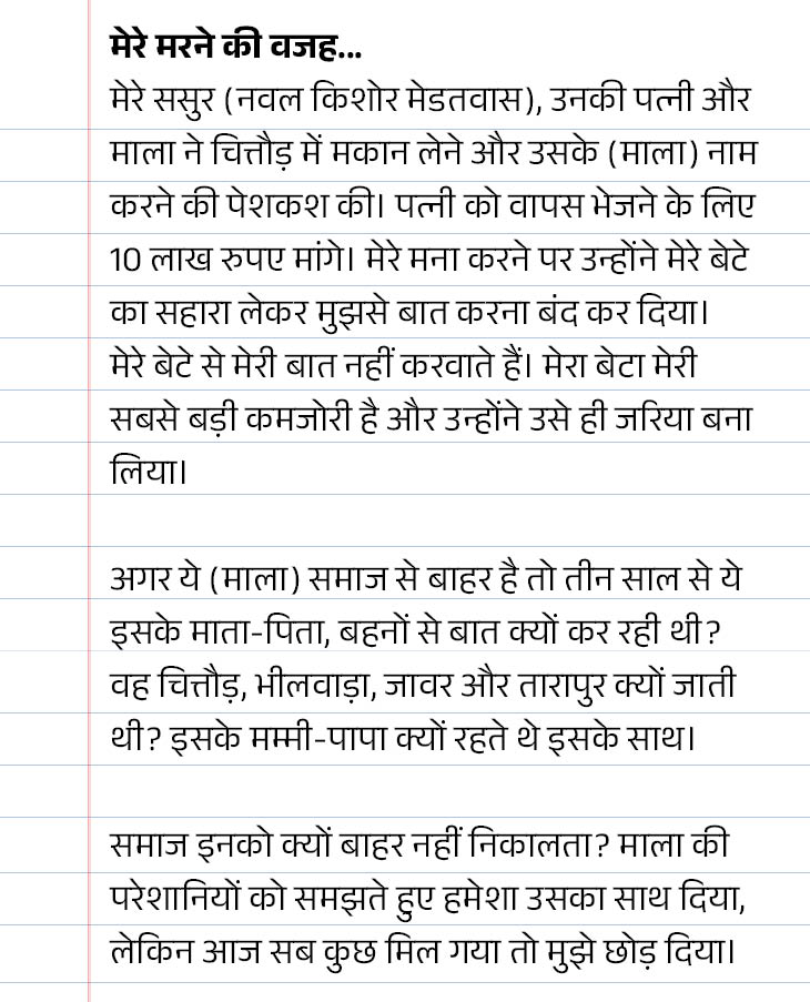 सुसाइड नोट में लिखा- माता-पिता की बातों में आकर दे रही तलाक मैं, सरित छीपा ये बयान देता हूं कि पिछले 4 साल से मेरी पत्नी माला मेरे साथ रह रही थी। उसकी पूरी जिम्मेदारी मेरी थी। उसके माता-पिता ने उसे अपनाने से इनकार कर दिया था, फिर भी मैंने उसे हर सुख और खुशी दी। आज वह अपने माता-पिता की बातों में आकर मुझे तलाक दे रही है, मेरे बेटे को मुझसे छीन रही है।