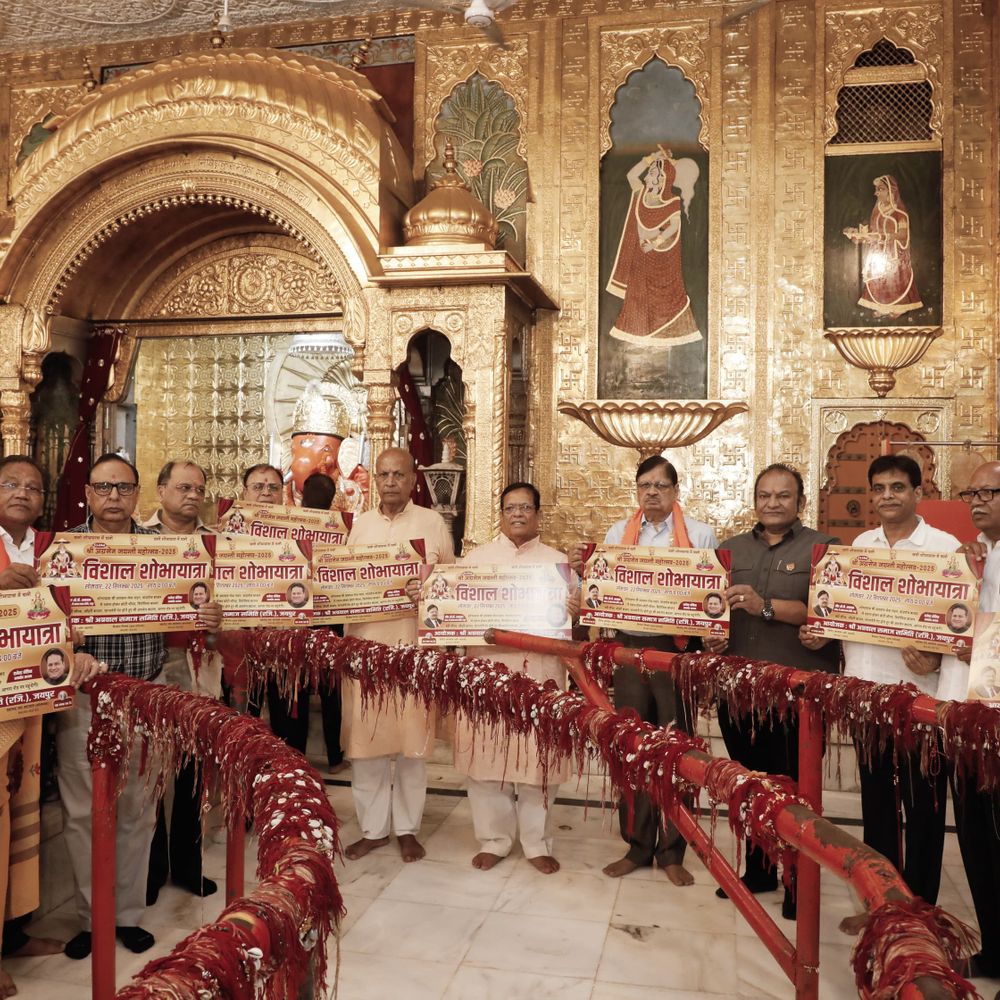 जयपुर में अग्रवाल समाज समिति की ओर से अग्रसेन जयंती समारोह का आयोजन किया जाएगा। यह कार्यक्रम 21 से 27 सितंबर 2025 तक चलेगा। समिति के अध्यक्ष ओ पी अग्रवाल के नेतृत्व में गुरुवार को मोती डूंगरी गणेश जी मंदिर में शोभायात्रा के कार्यक्रम का पोस्टर विमोचन