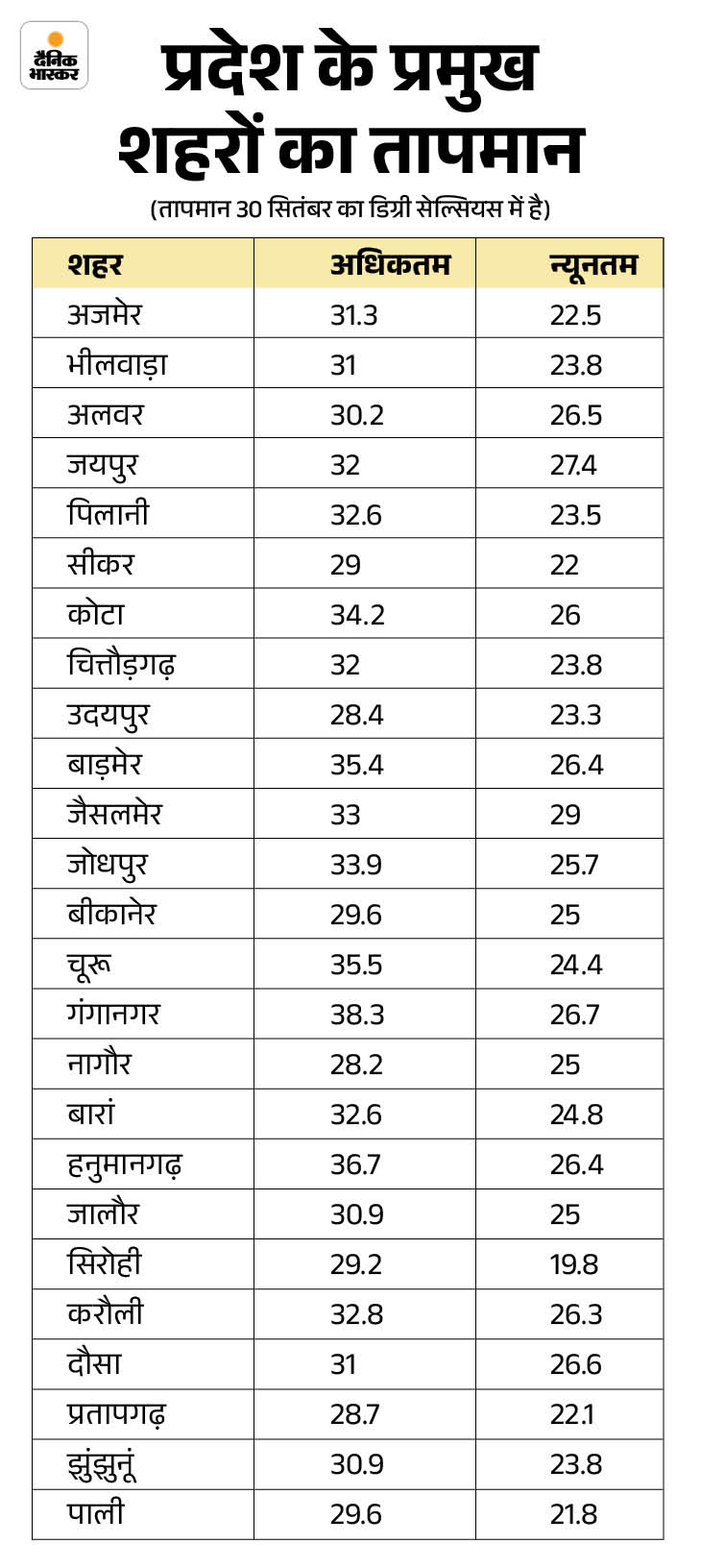 वहीं, दशहरा (2 अक्टूबर) पर भी तेज बरसात की आशंका है। मंगलवार को हुई बरसात के बाद रात के तापमान में दो-तीन डिग्री की गिरावट दर्ज की गई है।