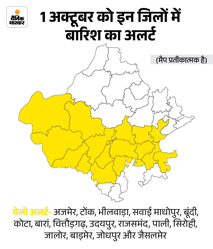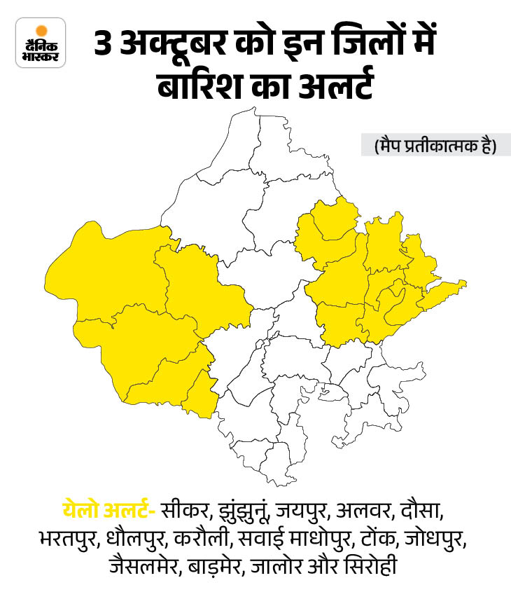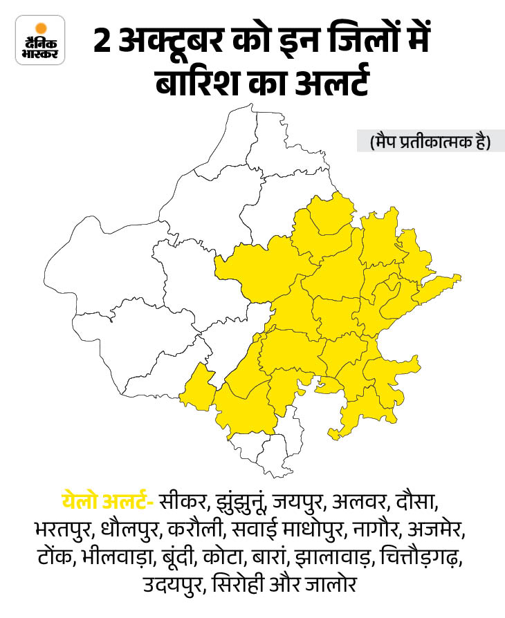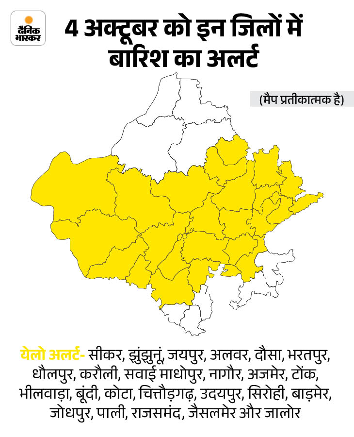 बुधवार को भी प्रदेश के 16 जिलों में तेज बारिश का अलर्ट है। मौसम केंद्र जयपुर के अनुसार बारिश का यह दौर 4 अक्टूबर तक जारी रह सकता है। बीते 2 दिन में बीकानेर, जयपुर, भरतपुर समेत अलग-अलग जिलों में 4 इंच तक पानी बरसा है।