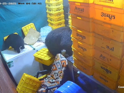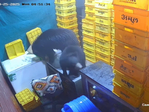 माउंट आबू के मुख्य बाजार के पास एक डेयरी में सोमवार सुबह करीब 4:49 बजे एक मादा भालू अपने दो बच्चों के साथ दुकान में घुस गई। भालू परिवार ने डेयरी में रखे फ्रिज को अपना निशाना बनाया। उन्होंने फ्रिज को खोलकर दही खाया और कोल्ड ड्रिंक की बोतलें भी निकालीं। इतना ही नहीं भालुओं ने शक्कर भी खाई और दुकान में रखा सामान इधर-उधर बिखेर दिया।