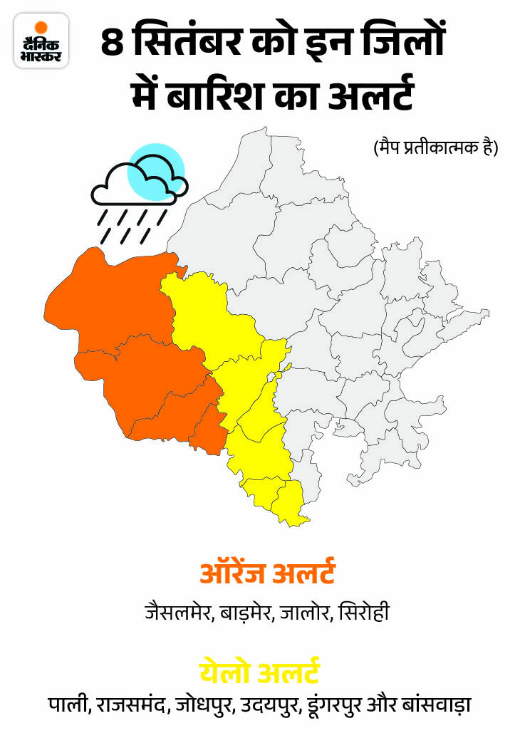 राजस्थान में तेज बारिश से नदी-नाले उफान पर हैं। सिरोही के माउंटआबू में 24 घंटे में 6 इंच से ज्यादा बारिश हुई। यहां सात घूम के पास सड़क का 100 फीट का हिस्सा धंस गया। मौसम विभाग ने आज (8 सितंबर) को 4 जिलों में ऑरेंज, 6 जिलों में येलो अलर्ट जारी किया है