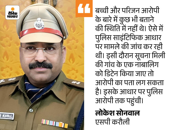 एसपी लोकेश सोनवाल ने बताया कि घटना की जानकारी मिलते ही तीन टीम गठित कर आरोपी की तलाश की गई। पुलिस ने तीन संदिग्धों से पूछताछ के बाद आरोपी नाबालिग को डिटेन किया। एफएसएल टीम घटना स्थल पर पहुंची और साक्ष्य जुटाए हैं। करौली डीएसपी अनुज शुभम मामले की जांच कर रहे हैं।