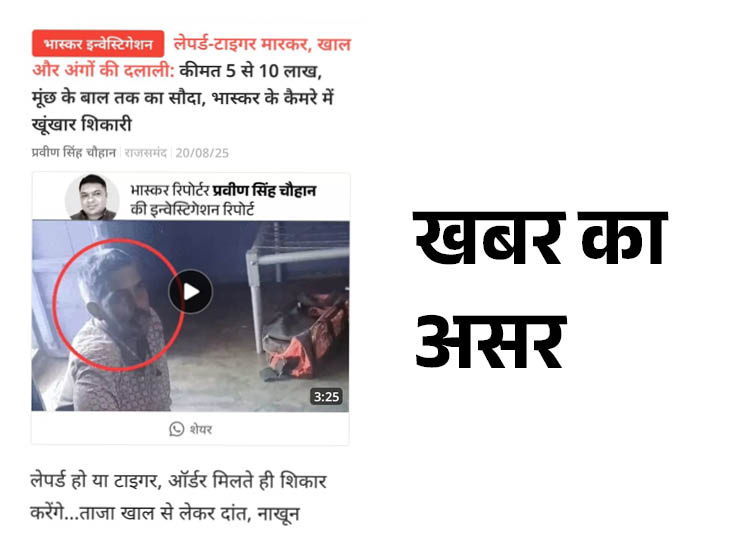 दैनिक भास्कर ऐप की खबर का बड़ा असर हुआ है। लेपर्ड-टाइगर को मारकर उनकी खाल और अंग बेचने वाले खूंखार शिकारियों के गिरोह को टीम ने लंबी पड़ताल के बाद बेनकाब किया था। खबर प्रकाशित होने के 24 घंटे के भीतर पुलिस और वन विभाग की टीम ने इन तीनों को गिरफ्तार कर