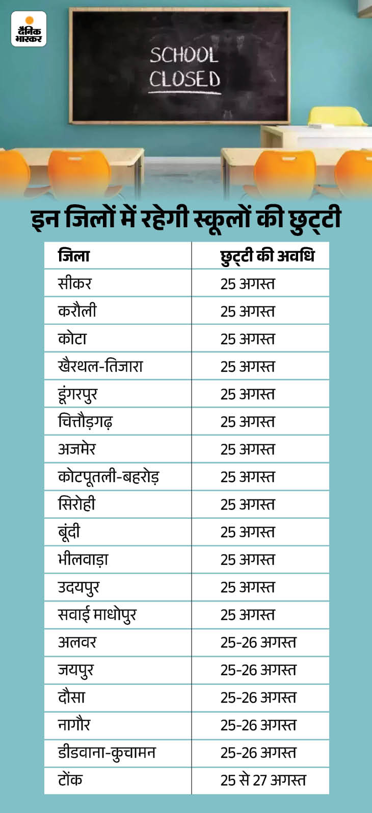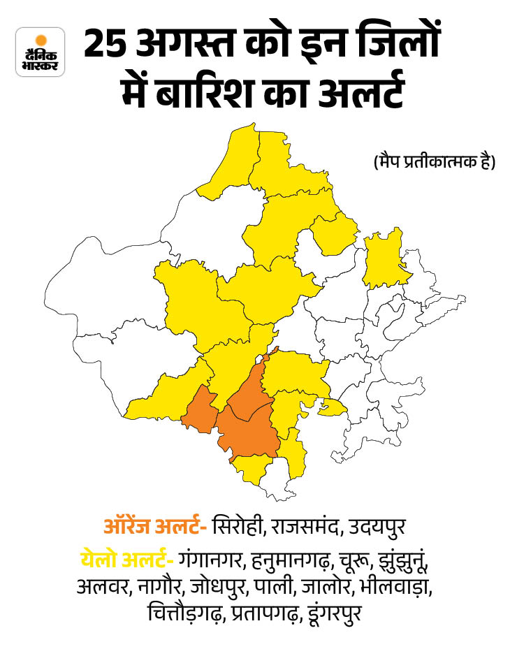 मौसम विभाग ने राज्य में तेज बारिश का दौर 27 अगस्त तक जारी रहने की संभावना जताई है। सोमवार को सिरोही, राजसमंद, उदयपुर में भारी बारिश का ऑरेंज अलर्ट जारी किया गया है। वहीं, 13 जिलों में येलो अलर्ट है। बारिश के अलर्ट को देखते हुए जयपुर-सीकर समेत 19 जिलों में कहीं एक तो कहीं दो तो कहीं तीन दिन की स्कूलों की छुट्टी घोषित की गई है।