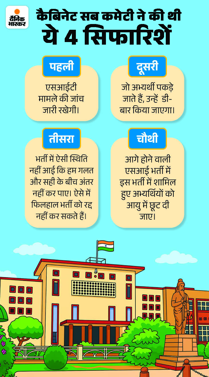 सरकार ने कहा था कि एसआईटी इस मामले की जांच करती रहेगी। जो कैंडिडेट पकड़े गए या पकड़े जाएंगे, उन्हें भर्ती प्रक्रिया से डी-बार किया जाएगा। कमेटी का तर्क ये था कि उसने जांच में ऐसी स्थिति नहीं पाई, जिससे कि पूरी भर्ती रद्द करनी पड़े। कमेटी ने यह भी कहा था कि भविष्य में होने वाली एसआई भर्ती में इस भर्ती में शामिल कैंडिडेट्स को आयु में छूट दी जाए।