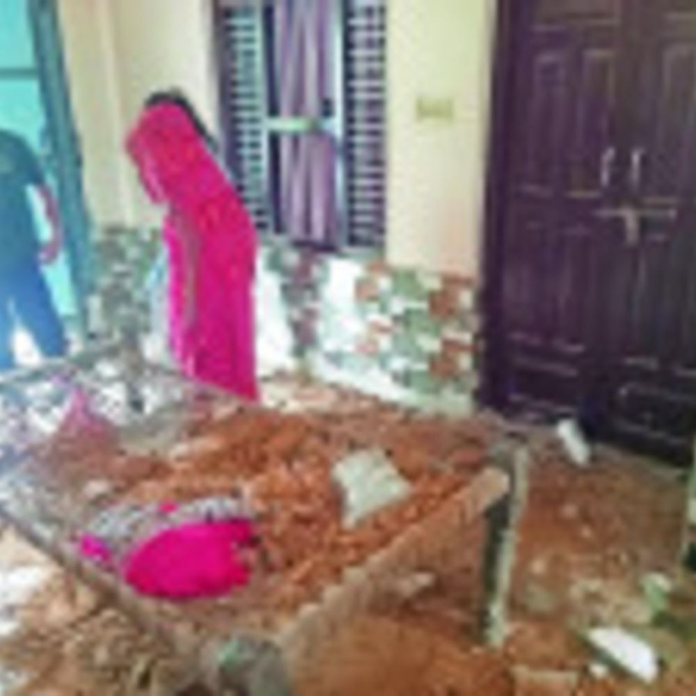 कुम्हेर. आकाशीय बिजली गिरने से मकान की टूटी पट्टियां और बिखरा मलबा और टूटा पड़ा पंखा।