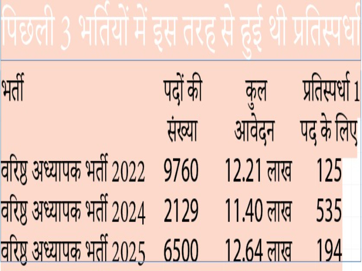 आरपीएससी की पिछली तीन वरिष्ठ अध्यापक भर्ती में एक पद के लिए आए आवेदनों को देखें तो पिछली 2024 की भर्ती में पदों की संख्या कम होने से कड़ा मुकाबला रहा था। वर्ष 2024 में एक पद के लिए 535 अभ्यर्थियों में मुकाबला था, जबकि इस बार कुल पदों पर औसतन 194 अभ्यर्थियों के बीच मुकाबला है। इसके अलावा वर्ष 2022 की भर्ती में सबसे कम 125 अभ्यर्थियों के बीच ही मुकाबला रहा था।