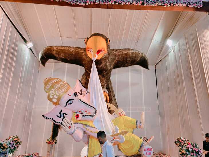 पद्मिनी पार्क में स्थापित श्री बड़ा गणपति महोत्सव समिति ने गणेश जी की प्रतिमा को एक बेहद अनोखे और कल्पनाशील रूप में पेश किया है। लगभग 18 फीट ऊंची इस मूर्ति में एक विशाल चील की चोंच से कपड़ा लटकता हुआ दिखाया गया है, जिसमें गणपति जी झूला झूलते नजर आते हैं। इस अनोखे और अलग प्रस्तुति ने लोगों का ध्यान तुरंत अपनी ओर खींच लिया और हर किसी की नजरें इस अनोखी मूर्ति पर ठहर गईं।