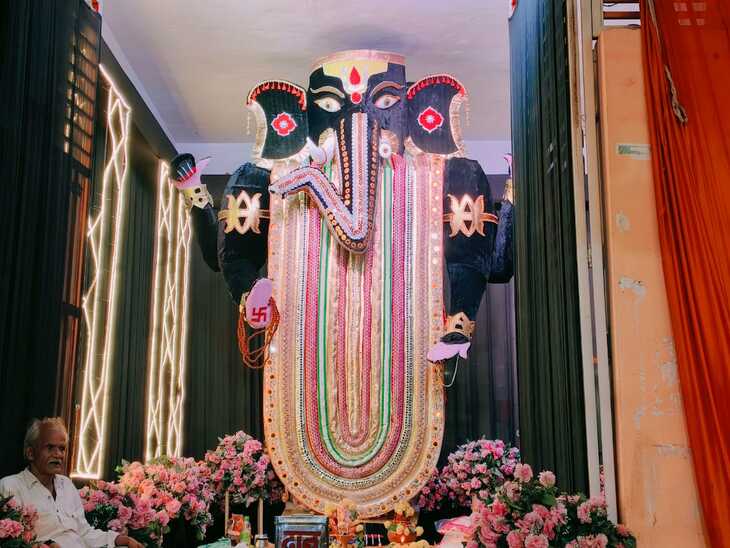 सूर्य दल की ओर से पावटा चौक पर लगभग 12 फीट ऊंची गणपति प्रतिमा स्थापित की गई है, जिसे तिरुपति बालाजी के रूप में प्रस्तुत किया गया है। यह विशेष मूर्ति पूरी तरह से बांस से तैयार की गई है, जिसे बनाने में करीब 40 दिन का समय लगा। समूह के सदस्यों रतन प्रजापत, राजकुमार, बोतलाल और मोहनीश ने बताया कि मूर्ति को आकर्षक ढंग से श्रृंगारित किया गया है और इसे पूरी तरह इको फ्रेंडली रखने का विशेष ध्यान रखा गया है। इस अनोखी मूर्ति का निर्माण प्रसिद्ध मूर्तिकार कमल प्रजापत द्वारा किया गया है।