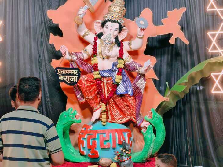 प्रताप नगर में स्थापित लगभग 8 फीट ऊंची गणपति जी की मूर्ति को “हिंदू राष्ट्र” थीम पर आधारित रूप में पेश किया गया है। गणेश जी को प्रताप नगर का राजा घोषित करते हुए यह दिखाया गया है कि हिंदू राष्ट्र पर अलग-अलग संकटों का रूप लिए सांपों ने चारों ओर से घेरा हुआ है, लेकिन भगवान गणेश ने उसे अब भी सुरक्षित रखा है। यह प्रस्तुति दर्शाती है कि पूरे विश्व और अखंड भारत का सुरक्षा कवच स्वयं भगवान गणेश हैं।