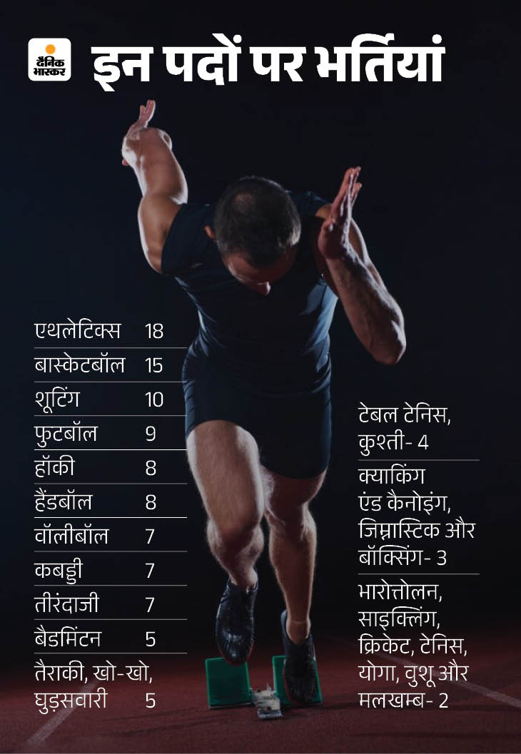 राजेन्द्र सिंह सिसोदिया ने बताया कि राज्य सरकार द्वारा 140 पदों पर भर्ती करने का फैसला किया गया है। इसके साथ ही बास्केटबॉल में 15, फुटबॉल में 9, हॉकी में 8, हैंडबॉल में 8, वॉलीबॉल में 7, कबड्डी में 7, तीरंदाजी में 7, बैडमिंटन में 5, तैराकी में 5 खो-खो में 5, टेबल टेनिस में 4, कुश्ती में 4, घुड़सवारी में 5, शूटिंग में 10, क्याकिंग एंड कैनोइंग में 3, जिम्नास्टिक में 3, बॉक्सिंग में 3, भारोत्तोलन में 2, साइक्लिंग में 2, क्रिकेट में 2, टेनिस में 2, योगा में 2, वूशू में 2 और मलखम्भ में भी 2 पदों पर भर्ती की जाएगी।