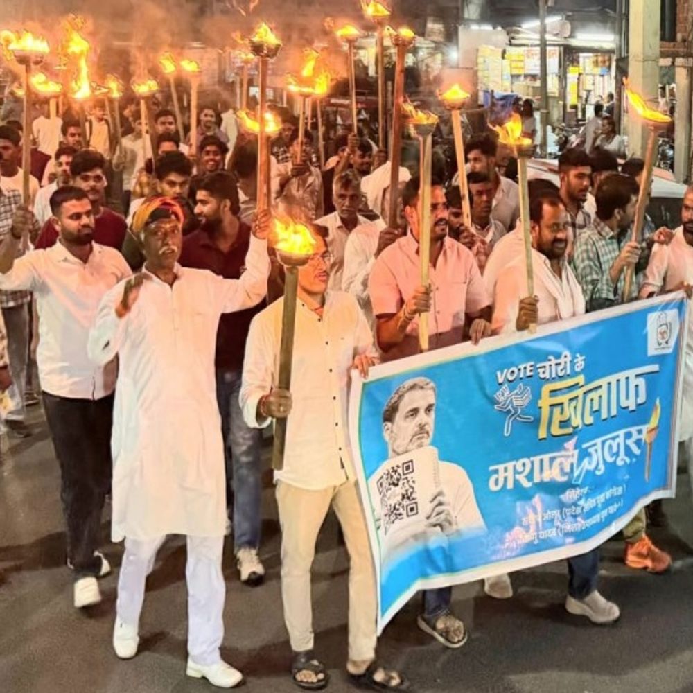 मशाल हाथ मे लिए युवा जुलूस निकालते हुए