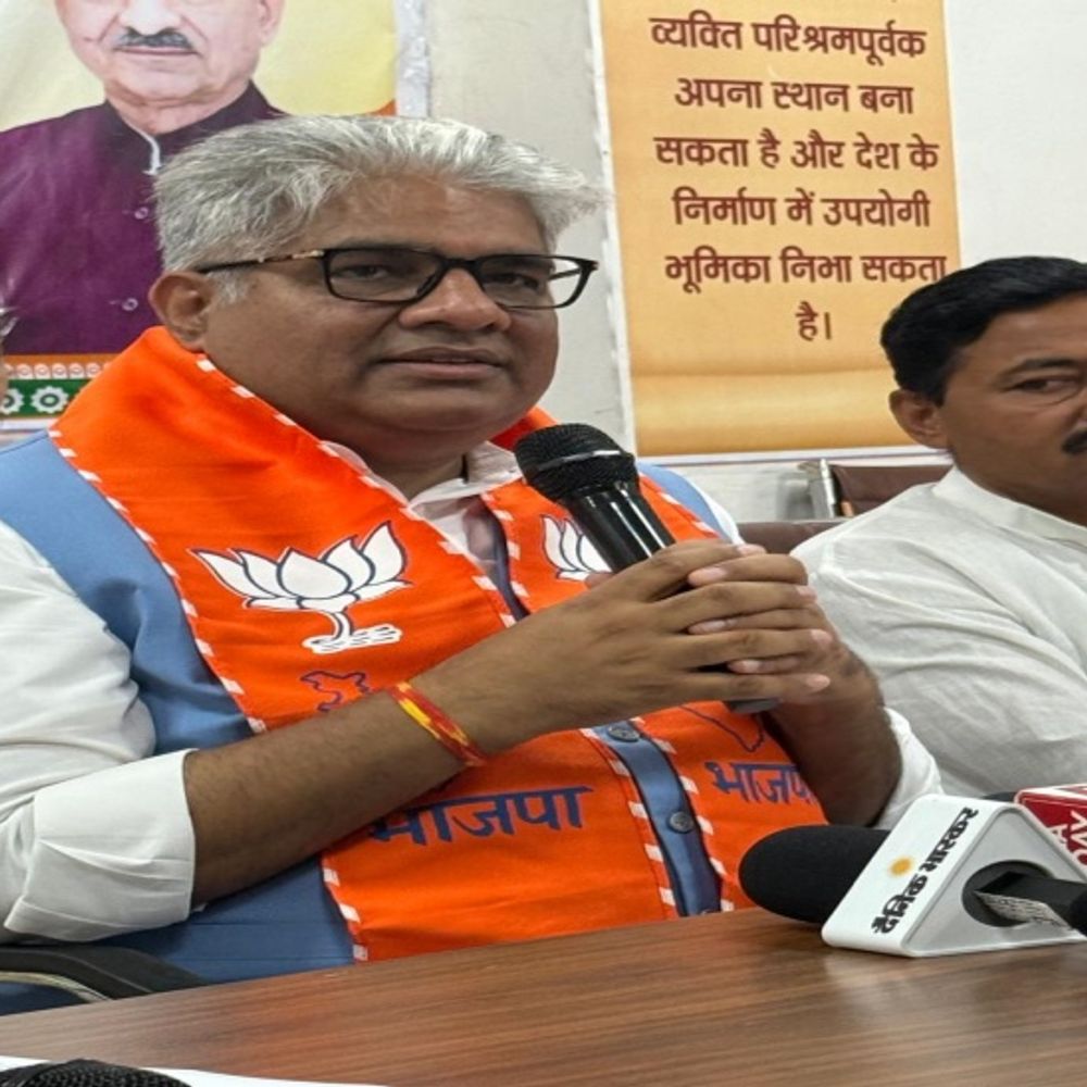 केंद्रीय मंत्री भूपेंद्र यादव मीडिया से बातचीत करते हुए।